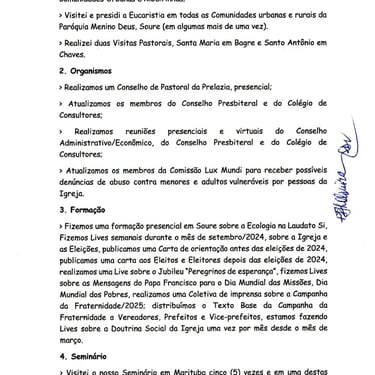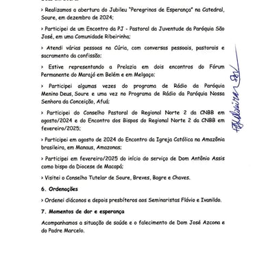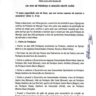 Em seu relatório, Dom José destaca que visitou todas as 10 paróquias da Prelazia, celebrando a Eucaristia tanto em matrizes quanto em comunidades urbanas, rurais, ribeirinhas e até em uma comunidade quilombola em Salvaterra.